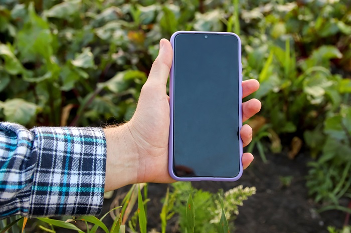 Phone mock-up outside, held by a farmer in a cornfield. The phone displays a blank, empty screen, emphasizing the farm agriculture concept.
